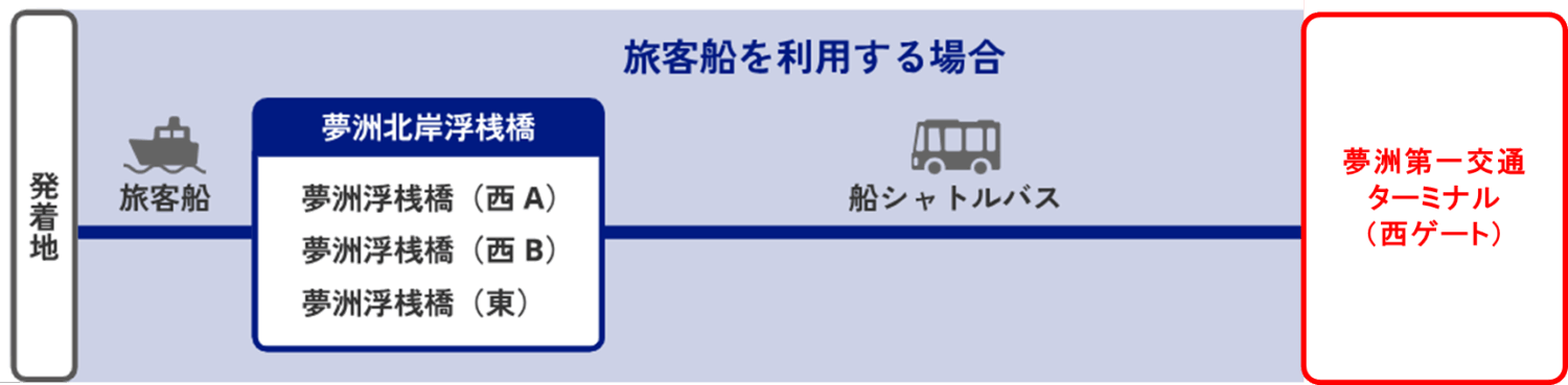 旅客船は、万博会場の「西ゲート」に繋がる「夢洲浮桟橋」発着です。西ゲートを利用する方のみ旅客船を利用できます 。