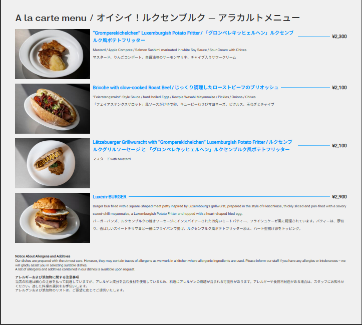 ルクセンブルクのノウハウが詰まった料理や地元産ワインなどの飲み物を味わい、お楽しみいただけます。ルクセンブルク・パビリオンの美食は、国立のホスピタリティ・ツーリズム学校EHTL(École d’Hôtellerie et de Tourisme du Luxembourg)が担当しており、ルクセンブルクの名物料理を日本風にアレンジして開発したメニューを提供しています。